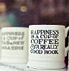 Description: Books, and coffee cup with "Happiness is a cup of coffee and a really good book" on the side.