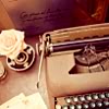 Description: A warm-toned picture of a typewriter and a rose on a desk.